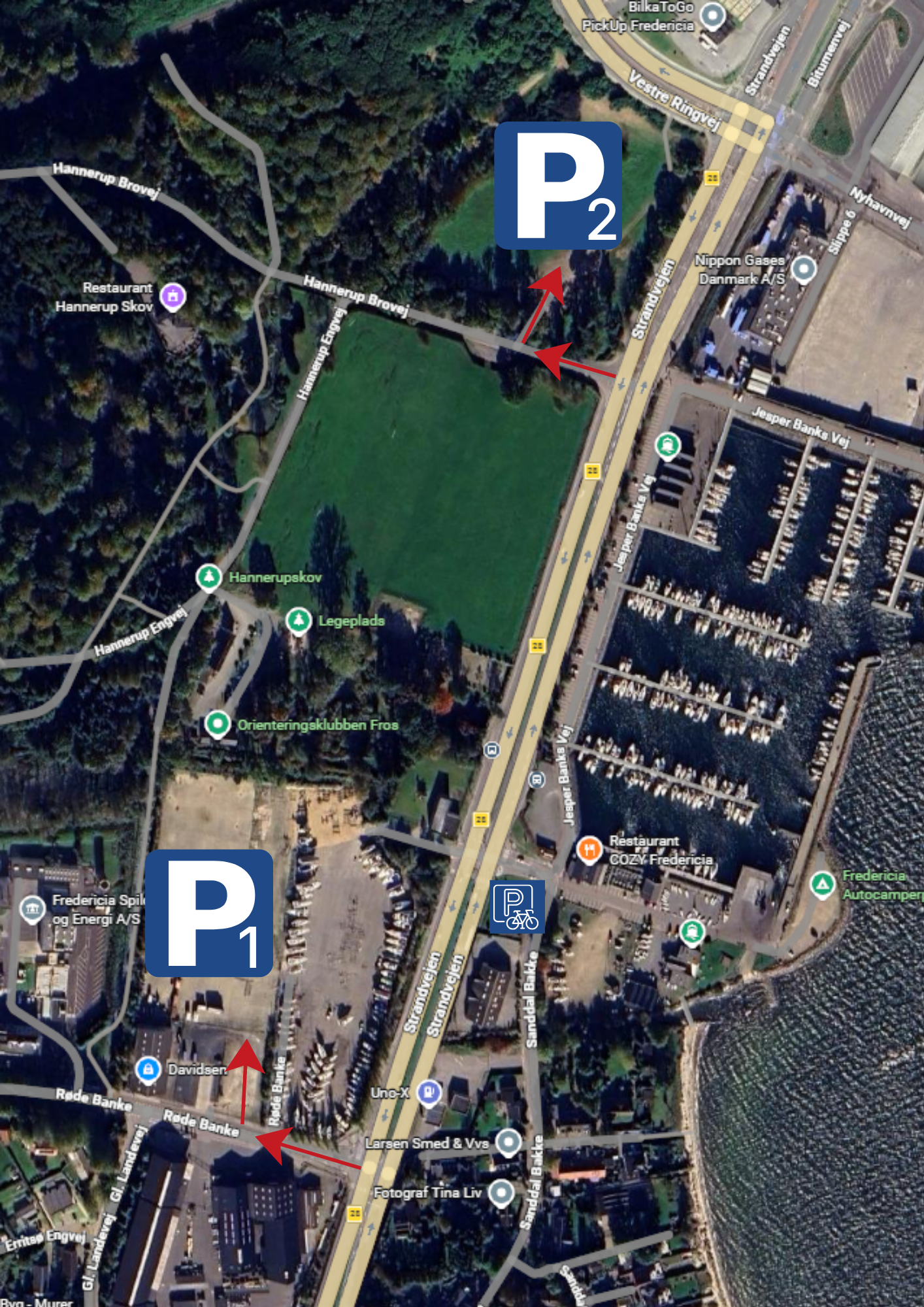 Parkering findes to steder overfor Marina Fredericia.