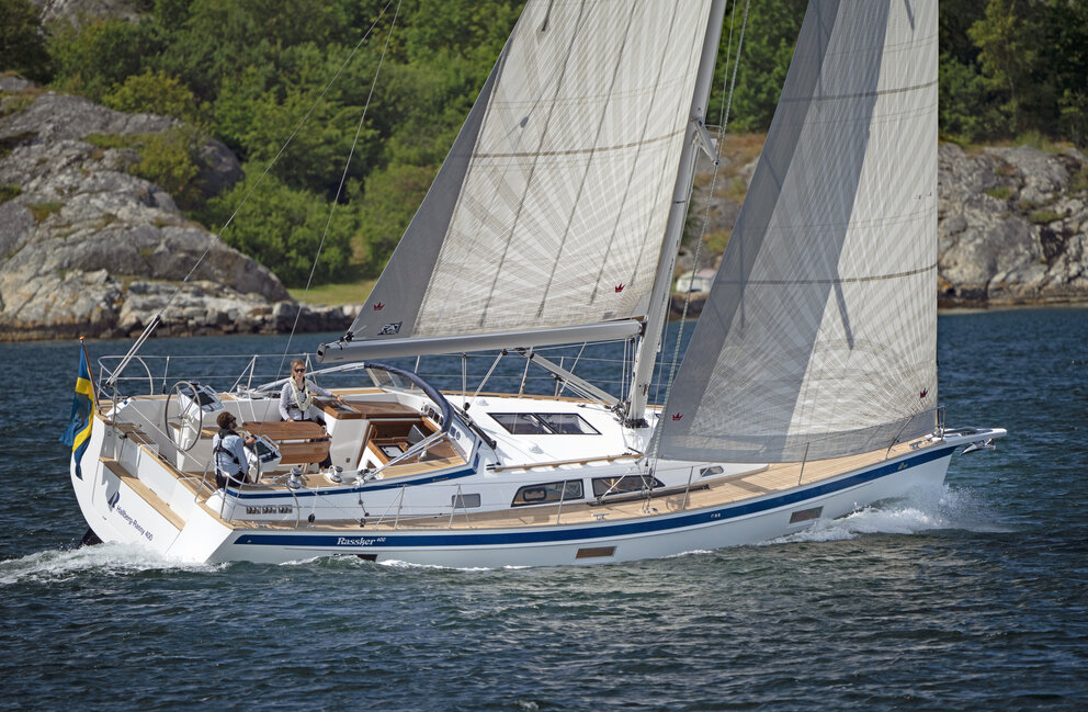 "Hallberg-Rassy 400 er blandt andet udstyret med hæk- og bovpropel, el-spil og rullestorsejl fra Seldén Mast."